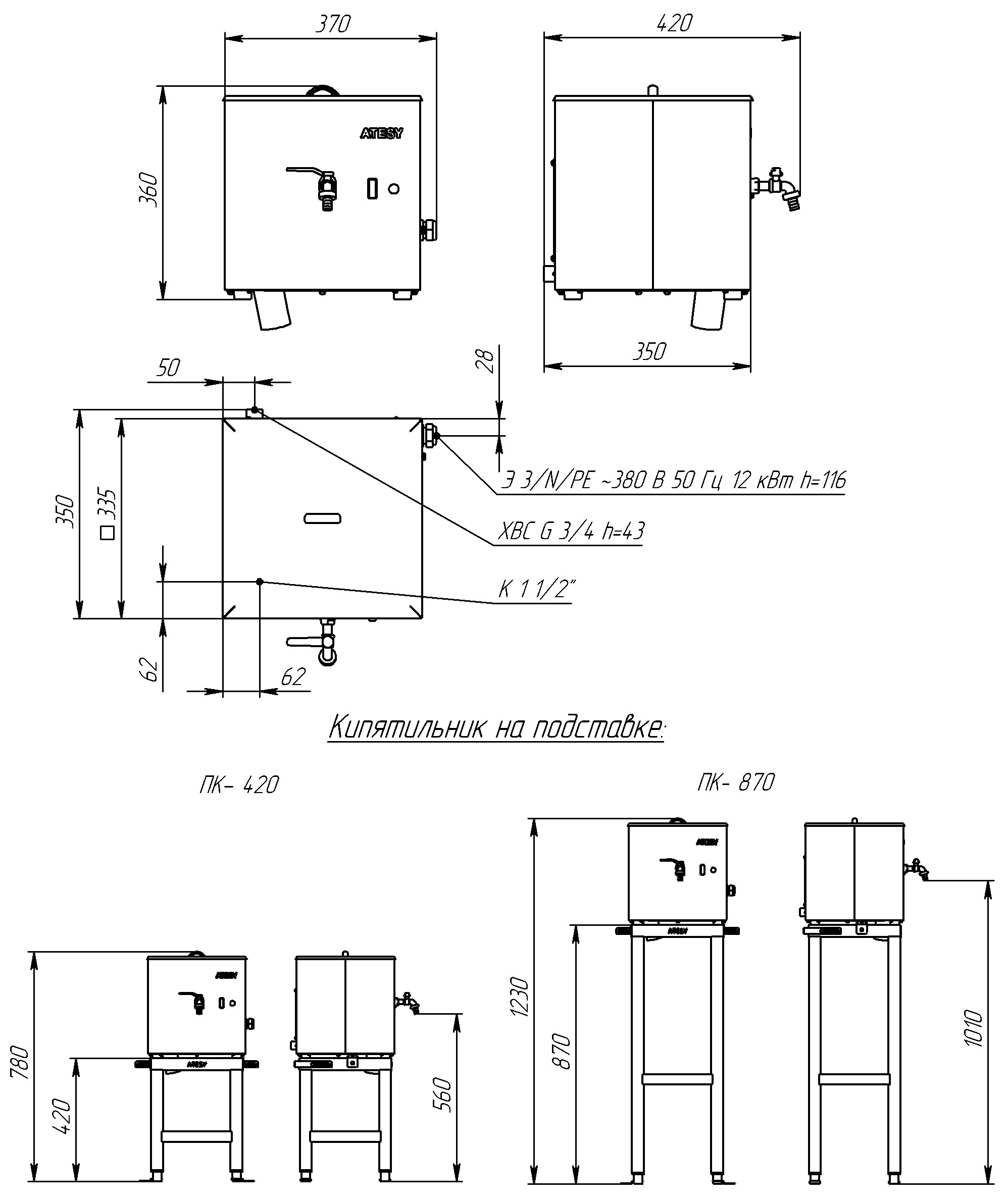 Корпус кипятильника изготовлен из нержавеющей стали AISI430. Внутренняя часть кипятильника состоит из кипятильного сосуда и сборника кипятка. Они изготовлены из нержавеющей стали AISI304. Вода из водопроводной сети поступает в кипятильный сосуд, где расположены ТЭНы мощностью 4 кВт – 3шт. ТЭНы осуществляют нагрев воды до температуры кипения. В процессе кипения вода поступает в сборник кипятка. Кипяток из кипятильника можно получить путем открывания крана, расположенного на корпусе. Кипятильник оснащен блоком управления нагревом, исключающим смешивание сырой воды с раздаваемым кипятком. Специальная конструкция крышки не позволяет конденсату стекать на корпус кипятильника. Кипятильник может устанавливаться либо на имеющиеся столы, либо на специальную подставку (поставляется отдельно).